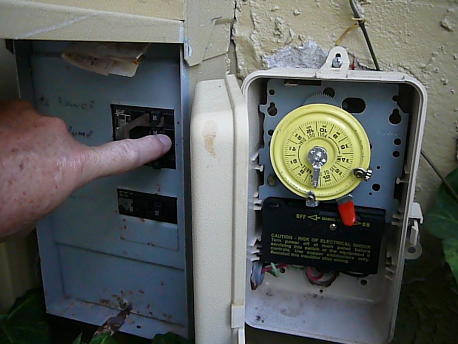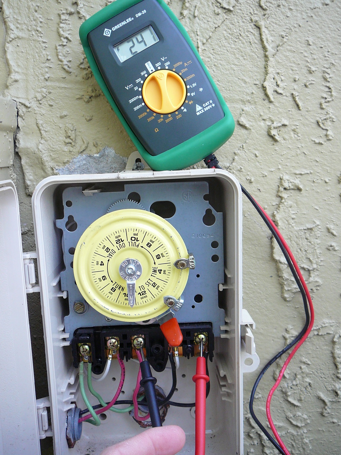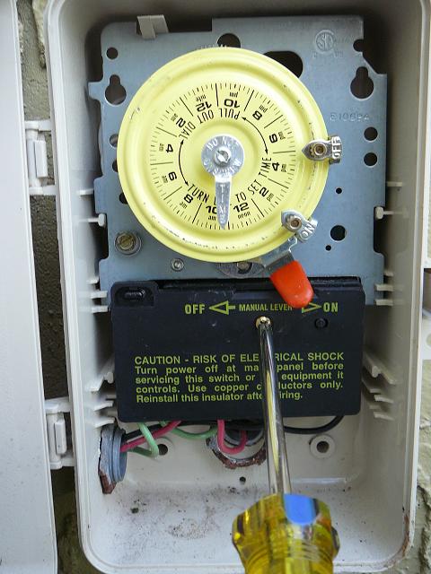 SELECT TEST POINTS - Voltage to the motor can be measured anywhere between the circuit breaker and the motor terminals One convenient test point is at the output terminals of your pump's timer, shown here. This picture shows the wiring inside the timer box. Three wires come in from the left of the box. Two are labeled INPUT and one GROUND. Generally, but not always, color of the wire is significant. If the two INPUT wires are red and black, they are both load wires and provide 240VAC. If they are white and black, white is neutral and black provides 120VAC. The green wires provide GROUND. The GROUND WIRES SHOULD BE ATTACHED TO THE GROUND SCREW JUST ABOVE TERMINAL "A". IT IS WRONGLY SHOWN IN THE CURRENT PICTURE AS GOING TO "A". There are 5 terminals in the timer box. The left most is A. The other four are labeled 1 to 4. The INPUT wires are connected to 1 and 3. The OUTPUT wires to 2 and 4. The OUTPUT wires are currently wired to the pump. Note: Not all timers are wired the same. This is the terminal configuration for an Intermatic timer. Check your timer to make sure which leads are the output lines.